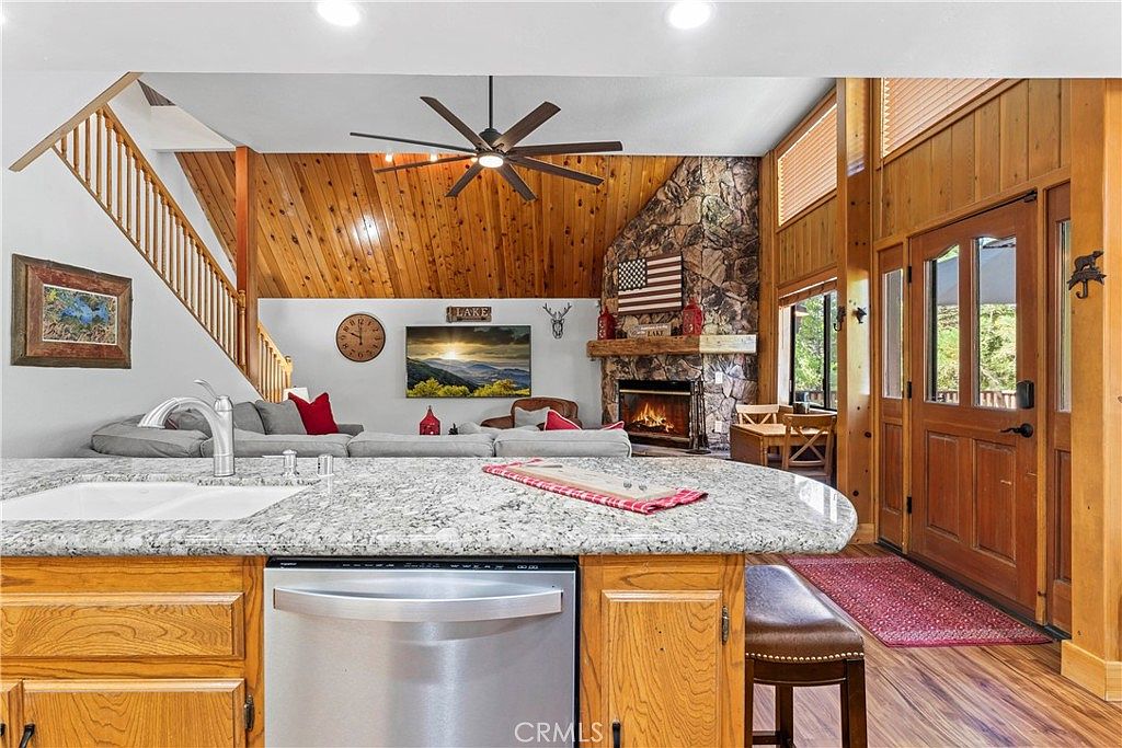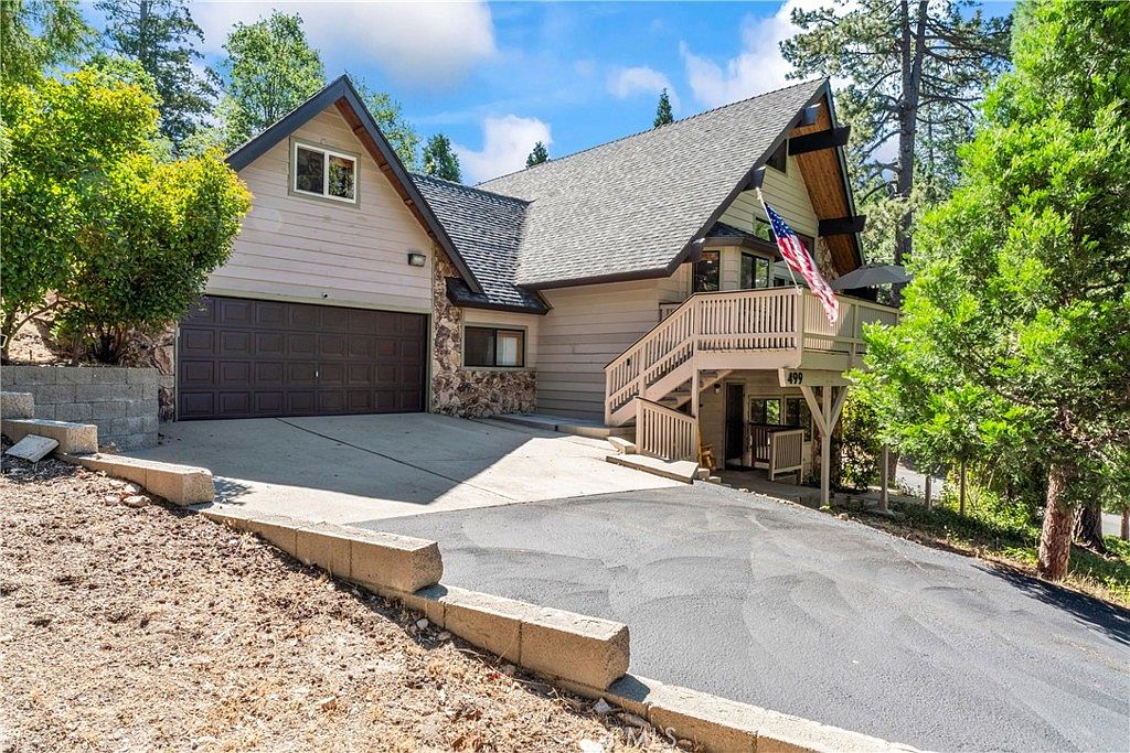 Location, Location, Location! Don’t miss this stunning and updated 1st tier golf course home with lake rights! Situated for avid golfers and mountain lake enthusiasts, this home is just a short walk from Grass Valley Lake and a brief golf cart ride to the Lake Arrowhead Country Club. This immaculate and turnkey home, featuring recent renovations completed in 2022, boasts 4 bedrooms and 3.5 bathrooms across approximately 3,253 sq./ft., including the room above the garage and a loft. The main level shows an open kitchen, dining, and living area with high vaulted wood beam ceilings and an abundance of natural light. The kitchen is upgraded with granite countertops and stainless-steel appliances, seamlessly connecting to the living room. Here, a 75” TV and a beautiful stone wood-burning fireplace with a custom barn wood mantel create the perfect setting for entertaining or relaxing with family. The dining room also features a custom kitchen bench seat and table. Two primary suites, located on the main and third floors, come with attached bathrooms and large closets with ample storage. All bathrooms are upgraded with granite countertops and soft-close cabinetry. The main floor also includes a laundry room with a washer and dryer. Smart Home Features: seven smart TVs, two Nest smart thermostats, smart switch outlets and security cameras. Includes two game rooms: The 1st floor room features TV, fireplace, wet bar, mini refrigerator, pool table, bedroom, and full bathroom and the room over the garage also includes TV and Foosball table. Attached two-car garage with a golf cart bay. Parking for multiple cars and three separate driveways with room for RV/boat parking. Situated on a larger, private corner lot, this home offers three decks with patio furniture, making it ideal for large families and groups of friends. Sleeps 12+ and includes several fun features for kids, such as a secret passageway between the 3rd-floor hall and loft leading to the room over the garage, and a custom playhouse with windows, doors, and a wraparound deck. Relax on the porch swing and enjoy the bottom floor, which could serve as a separate unit with a built-in small fridge, wet bar, and separate entrance. Offering everything needed for comfortable and luxurious living, whether as a permanent residence or vacation retreat, this home is a rare find with its modern amenities, ample space, and prime location. Comes furnished per inventory list, making it ready for immediate enjoyment!
